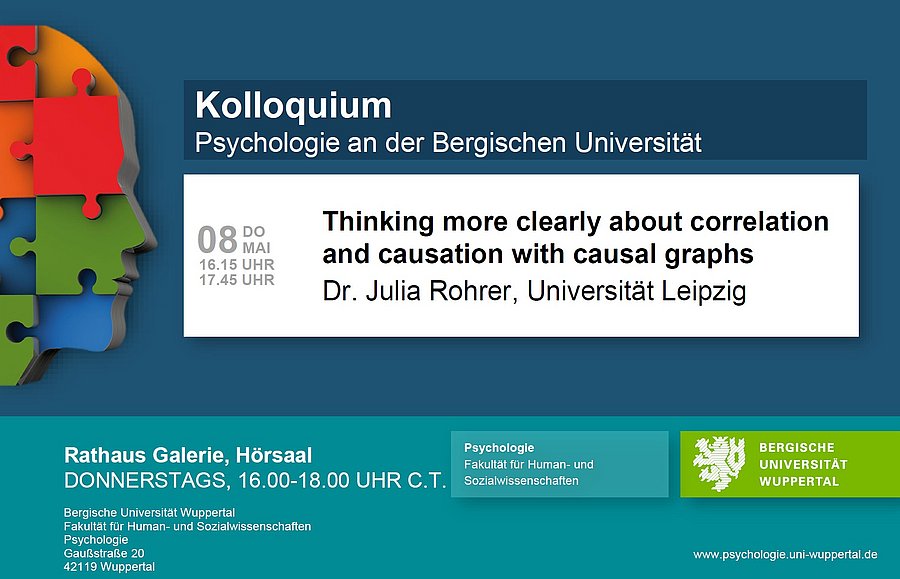 Der dritte Termin des Institutskolloquiums im Sommersemester 2025 findet am 08.05.25 von 16-18 Uhr (c.t.) statt. Frau Dr. Julia Rohrer (Universität Leipzig) hält einen Vortrag mit dem Titel: "Thinking more clearly about correlation and causation with causal graphs".