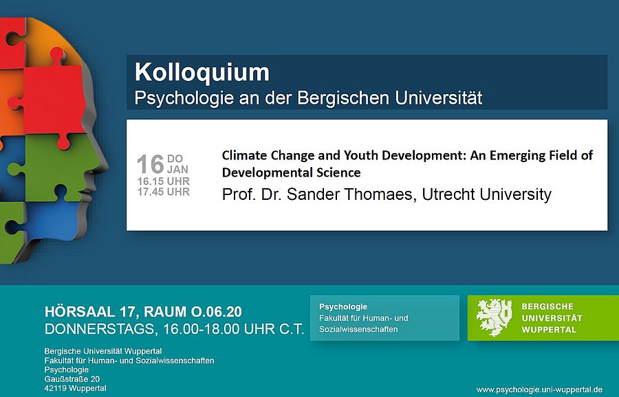 Der sechste Termin des Institutskolloquiums im Wintersemester 24/25 findet am 16.01.25 von 16-18 Uhr (c.t.) statt. Herr Dr. Sander Thomaes (Utrecht University) hält einen Vortrag mit dem Titel: "Climate Change and Youth Development: An Emerging Field of Developmental Science".