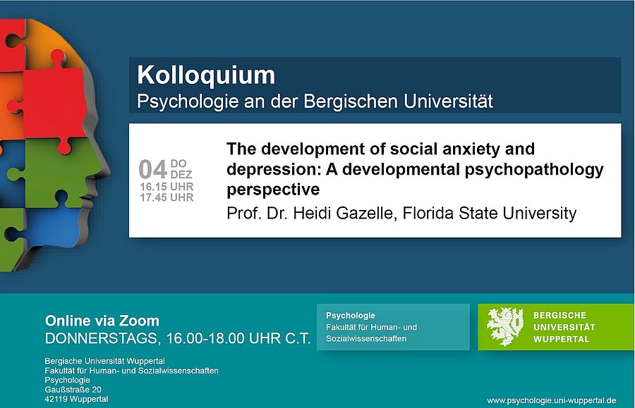 Der nächste Termin des Institutskolloquiums findet am 04.12.25 von 16-18 Uhr (c.t.) statt. Prof. Dr. Heidi Gazelle (Florida State University) hält einen Vortrag mit dem Titel: "The development of social anxiety and depression: A developmental psychopathology perspective".